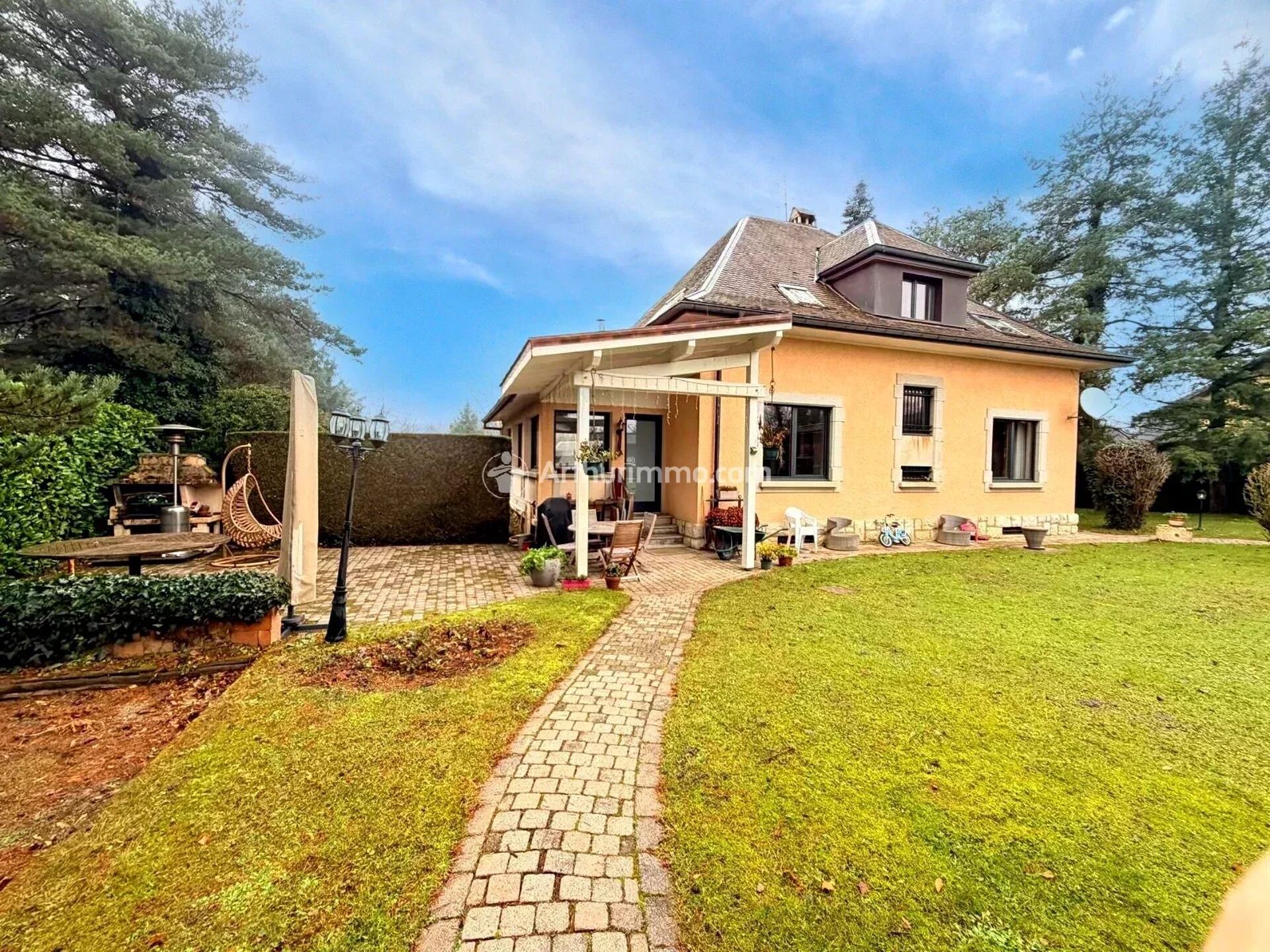 Située dans un environnement calme, à proximité de la gare de Bons-en-Chablais et de la frontière suisse, cette élégante maison de maître des années 1900 offre un cadre de vie rare et recherché. Édifiée sur un terrain arboré de 1920 m², elle présente environ 187 m² habitables et séduit par la qualité de ses matériaux et son fort potentiel.