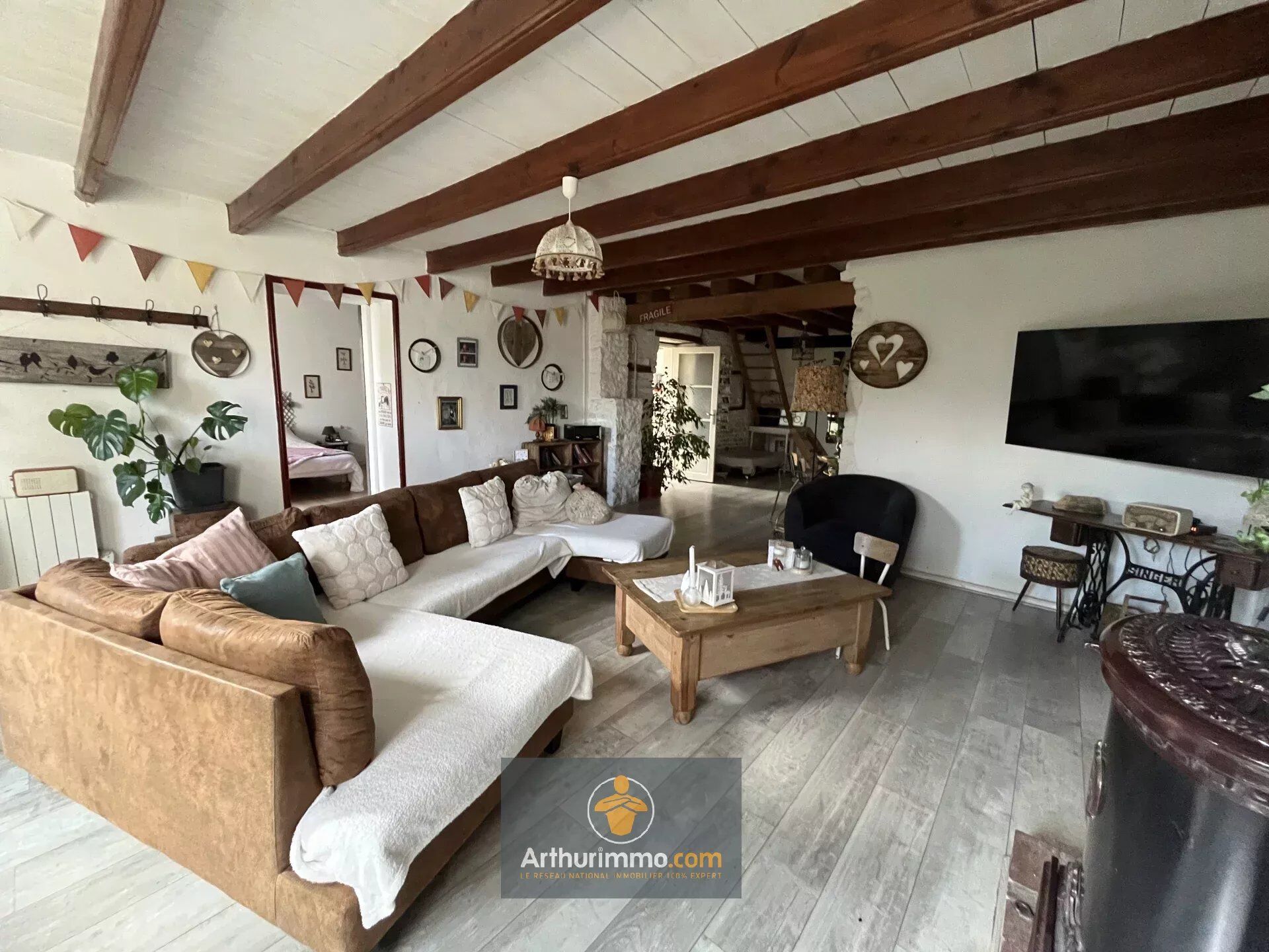 Un vaste salon-séjour lumineux avec son poêle à bois, une cuisine aménagée et équipée, un cellier, une salle d'eau, un toilette séparé et une grande chambre.