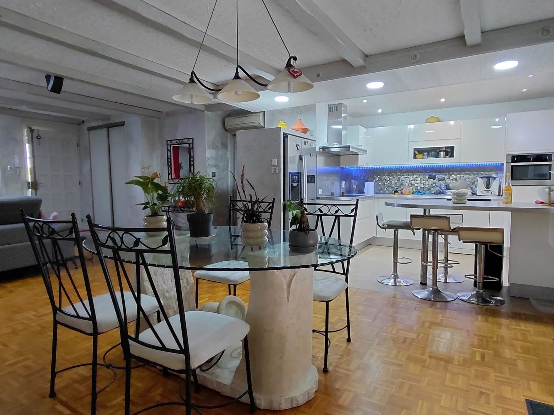 Composée d'un bel espace de vie de 55m2 avec cuisine ouverte contemporaine, poêle à granulés, climatisation réversible, puis d'un espace nuit avec wc, salle d'eau, trois chambres et une chambre supplémentaire sur un étage "mezzanine" de 10m2, l'ensemble bénéficie à l'extérieur de deux espaces distincts que vous apprécierez : coin piscine au calme avec cuisine d'été, et coin jardin cote sud.