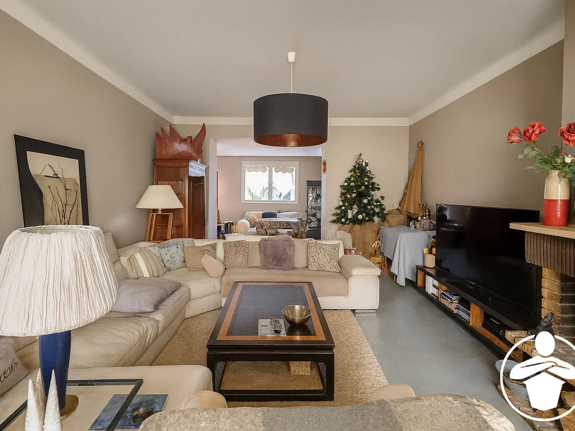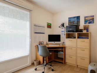 Le séjour cosy, agrémenté d’une cheminée, crée une atmosphère chaleureuse et conviviale. Un bureau ouvert sur le séjour complète l’espace de vie, idéal pour le télétravail ou un coin lecture.