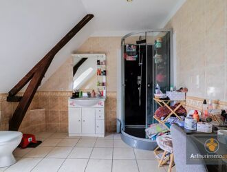 À l’étage, un palier dessert quatre chambres, deux salles de bains avec WC, un WC supplémentaire et une seconde cuisine — un vrai atout pour un projet en multi-logements.