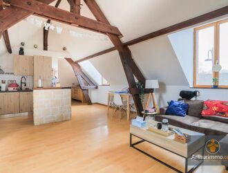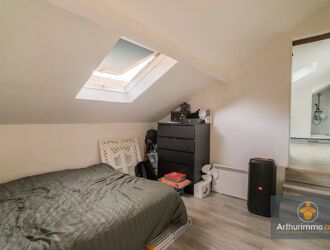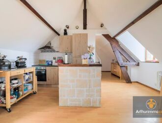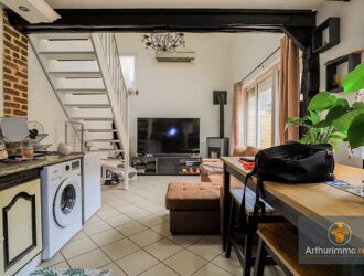 A l'étage, un appartement en duplex comprenant une entrée avec placard, une cuisine, un séjour salon avec cheminée, un WC indépendant et à l'étage une chambre et une salle de bains avec placard.