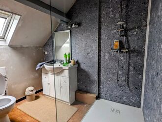 Au rez-de-chaussée, vous trouverez une pièce de vie lumineuse de 27 m² avec petit poêle Godin, ouverte sur la cuisine, ainsi qu’une salle de douche avec WC.