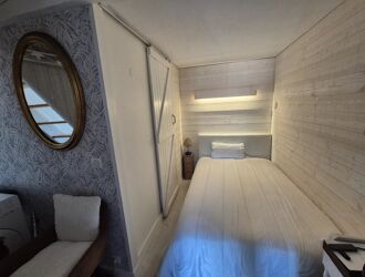 Le logement se compose d’un salon-séjour lumineux avec larges ouvertures sur le jardin, d’une cuisine équipée, d’un coin nuit en rez-de-chaussée avec salle d’eau, ainsi que d’une chambre en mezzanine.