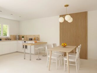 La cuisine ouverte, élégante et fonctionnelle, prolonge naturellement cet espace convivial, vous trouverez également un WC indépendant et une buanderie équipée d’un chauffe-eau thermodynamique, donnant accès au garage.