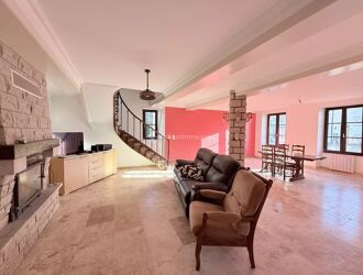 La maison est composée au rez-de-chaussée d'une cuisine aménagée et équipée, un grand séjour de 52m2 avec son escalier en fer forgé et sa cheminée, une salle d'eau avec WC et une chambre.