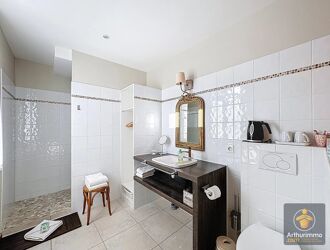 - à l'étage : une chambre, une salle de bains avec baignoire, douche et WC, une seconde chambre avec salle d'eau, WC, balcon et entrée indépendante (escalier extérieur).