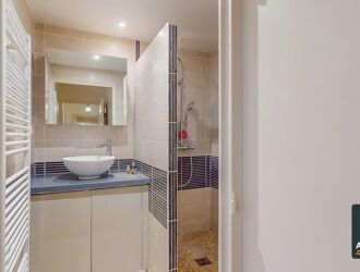 Doté de tout le confort moderne, le logement bénéficie de la climatisation et du double vitrage, garantissant bien-être été comme hiver. La salle de bains contemporaine avec douche à l’italienne séduit par ses matériaux de qualité et son agencement optimisé.
